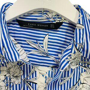 Zara Women's blouse top Blue White Stripe Floral Flowy Blouse size med