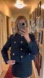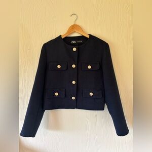 Zara Woven Knit Crochet Navy Blue Gold Button Down Cropped Flap Military Blazer Jacket