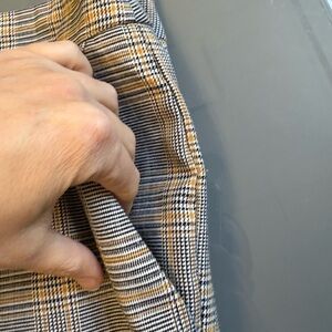 Description: These Zara trousers feature a classic glen plaid pattern in sophisticated black and yellow hues. Crafted from a medium-weight fabric, they offer a tailored look ideal for formal occasions or cooler weather. The straight-legged cut adds a timeless elegance to your wardrobe.