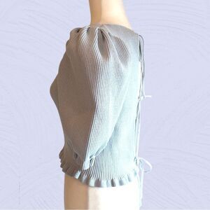 Adorable open back knit top from Zara. Baby blue ribbed knit, cropped length with adorable puff sleeves and a fully open back with three ties. Size medium, super stretchy and the open back can adjust to fit any range of medium. Excellent condition.