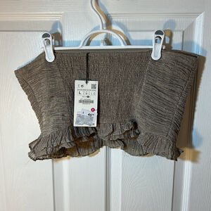 New with tags Zara bandeau cropped top in size Large, taupe color, made from 100% cotton. Excellent new condition. Measurements: 18 inches across from armpit to armpit and 9 inches in length.