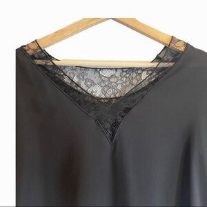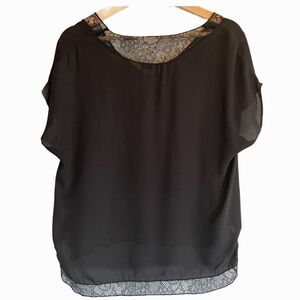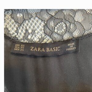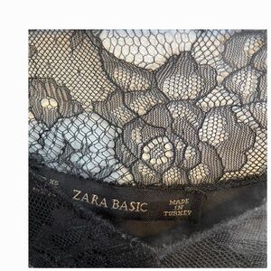 Zara Basic black short-sleeved shirt. Features V-neck with lace detail around, lace hemline and boxy style.