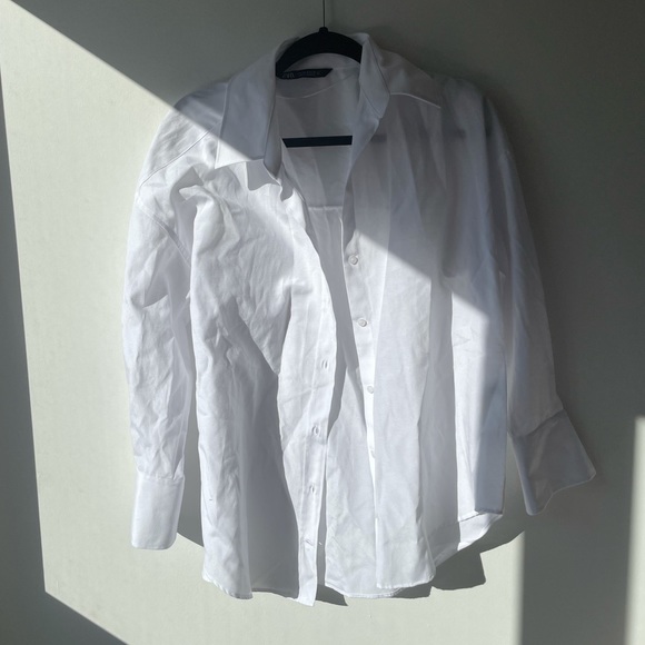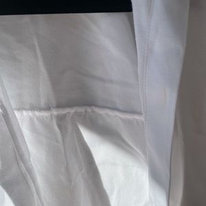 Stiffer material, boyfriend cut. Small makeup mark on the inside fabric, near the buttons. Bought two sizes and am keeping the larger of the 2. No tags but only tried on.