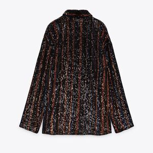 Zara black & burnt orange sequin pinstripe button-down shirt Sz M NWT