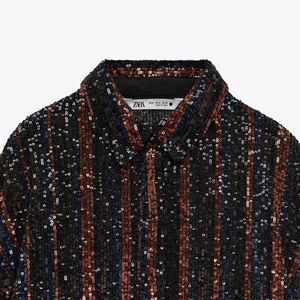 ZARA black & burnt orange sequin pinstripe button-down shirt Sz M NWT