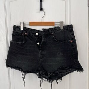 High Rise. Frayed Hem. High-waisted rigid fabric shorts with five pockets. Front metal button closure.