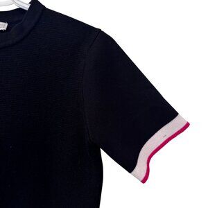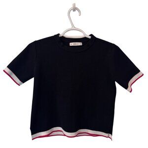 A black ZARA knit short-sleeve top featuring red and white stripe detailing on the hem and sleeves. The style of this top is casual, suitable for everyday wear. It can be paired versatilely with items like leggings, shorts, jeans, or skirts for a relaxed yet stylish look.