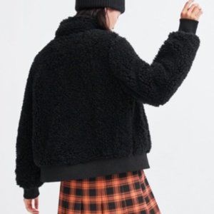 Zara black short Teddy coat, bomber style, elastic cuffs and waist, zippered closure, zipper runs smooth, stand up collar, fully lined, 100% polyester. Great condition.