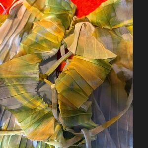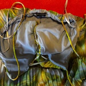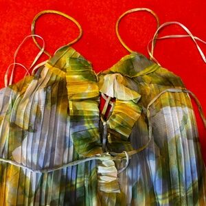 Zara blue, yellow white and green tulle pleated maxi dress in excellent used condition (worn once and washed). V-neckline that’s adjustable with crossed strap laces, ruffles, thin elastic spaghetti straps, contrasting inner lining, pleated texture, 95% polyester and 5% elastane weave that’s stretchy, lightweight and will keep you cool during the hot temperatures. Very feminine and romantic, it would fit maxi or midi depending on your height. Perfect for traveling because it’s lightweight and doesn’t wrinkle. In my opinion and experience (I wear a bra size B) you don't have to wear a bra with it, because the cups are lined and pretty supportive. Marked size M. All measurements are approximate and taken with the garment laying flat: Armpit to armpit 14" (it stretches up to 20’’) Total length 45" (from the middle of chest). This item comes from a smoke free, pets friendly home. Recycled bags/box used when possible. Please, let me know if you'd like any additional info. Thanks for watching!
