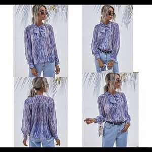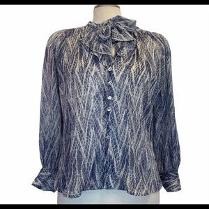 Zara blue metallic gold thread Tie Neck Button Up Blouse Sz S