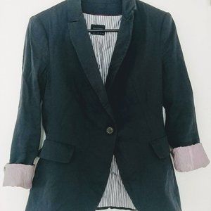 Zara boyfriend navy blazer size Small S 62% cotton. Full liner striped roll-up sleeve cuffs short jacket, 1 button, no pockets. Women's. Trendy business casual. Works great with a pair of jeans. Basic classic