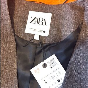 Zara brown marl V-neck viscose and cotton cropped blazer coat new with tags. Blazer made of 48% viscose, 26% cotton and 26% polyester, V-neckline and long sleeves with openings and buttons, flap pockets at front, interior lining made of 100% viscose, back slit at hem, front hidden button closure. Very elegant and chic, old money vibe. Colour is accurate in the stock photos, mine are taken in artificial light. Marked size L large, please see pictures for measurements. This item comes from a smoke free, pets friendly home. Recycled bags/box used when possible. Please, let me know if you'd like any additional info. Thanks for watching!