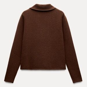 Zara chocolate brown 100% wool cardigan new with tags. Blazer style jacket made of 100% wool, lapel collar, long sleeves, false front pockets with flaps, front double breasted button closure. Soft and not itchy at all in my opinion. Colour is accurate in the stock photos, mine are taken in artificial light. Marked size M Medium. All measurements are approximate and taken with the garment laying flat : Armpit to armpit 19.5", total length 20". This item comes from a smoke free, pets friendly home. Recycled bags/box used when possible. Please, let me know if you'd like any additional pictures and/or measurements or other info. Thanks for watching!