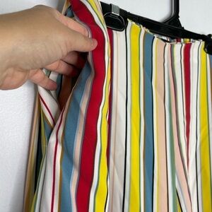 In good condition gently worn. 97% polyester 3% elastane. Elastic waist with tied can be worn front or back. Wide cropped legs. Colorful stripes. Measure lay flat: waist 14,5'' hips 20'' rise 12'' inseam 20'' bottom wide 15''.