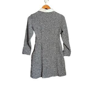 The dress, as described on the website, features a short collared design with long sleeves, contrast satin fabric detail, pintucks on the front, golden button fastening at the front, and an invisible side zip fastening. The black and white color combination adds a touch of boldness to your ensemble.