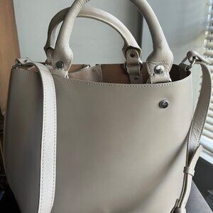 Size: 17” x 11.5” x 7”. Color: Tan with silver tone hardware. 42” shoulder strap. Two handles 14”. Inner canvas pouch to store valuables. Open top. Front decorative zipper. NWT.