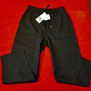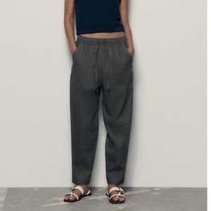 Zara dark grey high waist tapered linen blend pants new with tags. Linen and viscose blend fabric that doesn’t seem to wrinkle, high rise, elastic drawstring waistband, front and back patch pockets. Marked size US M. All measurements are approximate and taken with the garment laying flat: Waist 14" (it stretches a lot) Front rise 13" Inseam 26" This item comes from a smoke free, pets friendly home. Recycled bags/box used when possible. Please, let me know if you'd like any additional info. Thanks for watching!