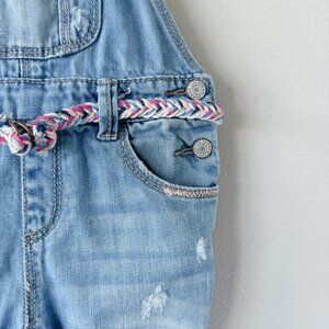 Medium wash distressed overalls by Zara for baby girl. Comes with braided colourful belt. Adjustable straps.