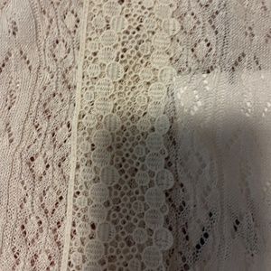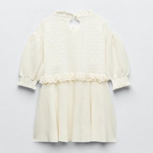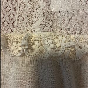 Zara ecru cream pointelle and lace knit top new with tags. Round neck top with short balloon sleeves, fabric made of cotton, modal and poly with lace trim, back opening with button closure. Marked size L, please see pictures for measurements. This item comes from a smoke free, pets friendly home. Recycled bags/box used when possible. Thanks for looking!