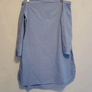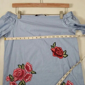 Zara beautiful Blue with micro stripe and embroidered off the shoulder summer dress with side cut , more of a shirt dress and 3/4 sleeve with adjustable colarbone style