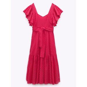 Zara eyelet Cutwork Embroidered Midi Dress Size S hot pink