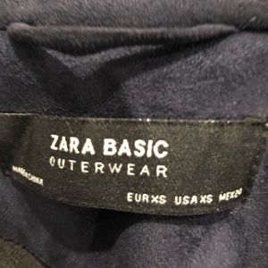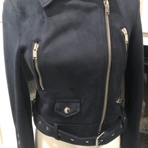 Warm navy faux suede biker jacket with zips on cuffs and pockets.