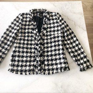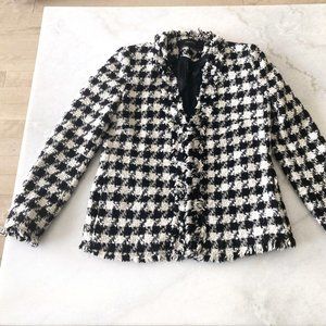 Zara frayed checked blazer black & white woven houndstooth jacket / coat, size S
