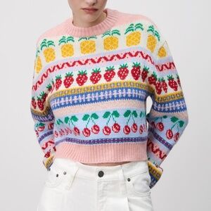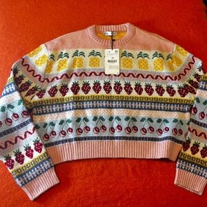 Zara fruit jacquard sweater new with tags. Long sleeve, round neck, super soft knit made of 78% acrylic, 18% polyester and 4% polyamide, cute and trendy pattern featuring pineapples, strawberries and cherries on a pink and light blue pastel background. Limited edition sweater discontinued two years ago. Colour is accurate in the stock photos, mine are taken in artificial light. Marked size L, please see photos for measurements (it’s very stretchy). This item comes from a smoke free, pets friendly home. Recycled bags/box used when possible. Please, let me know if you'd like any additional pictures and/or measurements or other info. Thanks for watching!