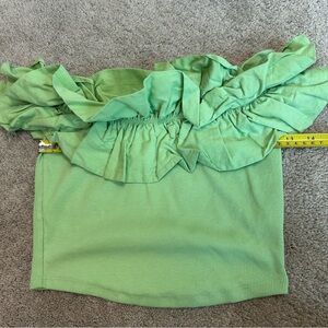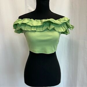Zara green ribbed ruffle frill neckline off the shoulder fitted crop top M NWOT