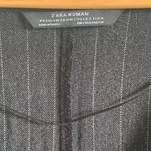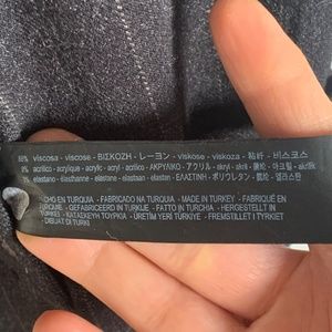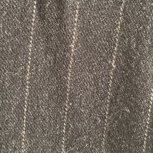 Dark grey/brown pinstripe jumpsuit. Relaxed fit, buttons up the front; patch pockets and single back pocket. Slightly dropped crotch; slightly cropped with tapering leg. Very comfortable and easy to dress up or down. Viscose/acrylic/elastane blend has a 'wool' feel.