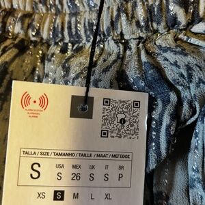Zara khaki green and metallic fibre elastic waist long skirt new with tags. High waist, adjustable elastic drawstring waistband, print detail with metallic thread detail, interior lining. 94% viscose and 6% metallized fiber. Colour is accurate in the stock photos, mine are taken in artificial light. Strong peasant boho vibe. Marked size S but fits larger, the waist is elasticated and it stretches a lot, so it could fit size M and L well in my opinion. All measurements are approximate and taken with the garment laying flat: Waist 13" (it stretches up to 19’’-20’’) Total length 37. This item comes from a smoke free, pets friendly home. Recycled bags/box used when possible. Please, let me know if you'd like any additional info. Thanks for watching!