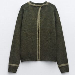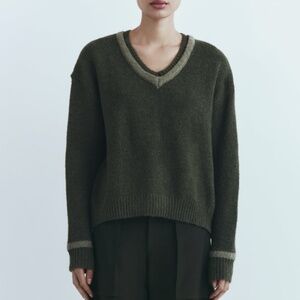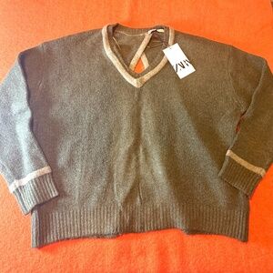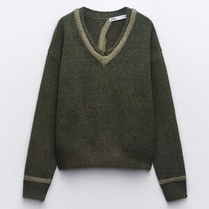 Zara khaki green open back soft knit sweater new with tags. V-neck, long sleeve, back opening, contrast piping detail, rib trim, oversized fit, super soft, fluffy and stretchy jersey made of 59% polyester, 25% acrylic, 14% polyamide and 2% elastane. So cool and unique! Colour is accurate in the stock photos, mine are taken in artificial light. Marked size M Medium. All measurements are approximate and taken with the garment laying flat : Armpit to armpit 25", total length 24". This item comes from a smoke free, pets friendly home. Recycled bags/box used when possible. Please, let me know if you'd like any additional info. Thanks for watching!