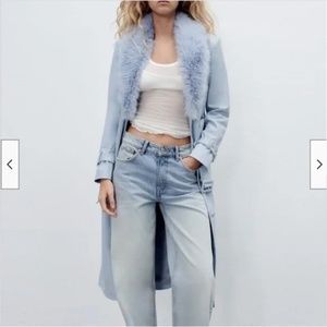 Zara light blue belted faux leather trench coat new with tags. V-neck, detachable faux fur trim with lapel collar underneath, long sleeves with cool buckles details at hems, shoulder pads and tabs, front welt pockets, belt with a covered buckle in the same fabric, back vent, it fastens at the front with covered buttons. Colour is accurate in the stock photos, mine are taken in artificial light, sorry about that. 100% polyester and polyurethane. This is possibly the most beautiful coat I’ve ever seen. So gorgeous and unique, it looks and feels luxurious. Marked size L. All measurements are approximate and taken with the garment laying flat: Shoulders 19’’ Pit to pit 22.5" Total length 47’’ Sleeve from shoulder 25’’. This item comes from a smoke free, pets friendly home. Recycled bags/box used when possible. Please, let me know if you'd like any additional pictures and/or measurements or other info. Thanks for looking!
