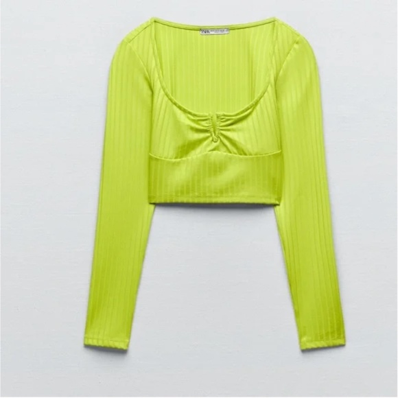 Zara lime neon green long sleeve ribbed cropped top new with tags. Long sleeves, cute ruched V detail in the middle of the scoop neckline, super stretcy poly and elastane jersey, very elegant and chic in the trendiest colour of the year. Marked size M, please see pictures for measurements. This item comes from a smoke free, pets friendly home. Recycled bags/box used when possible. Please, let me know if you'd like any additional pictures and/or measurements or other info. Thanks for watching!