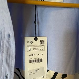Zara shirt - button up with satin printed material at the back. Oversized fit. Longer at the back than the front.