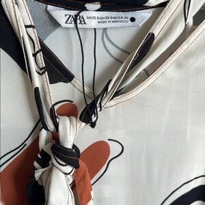 A Zara Abstract Print Midi Dress. It features an abstract print in a color palette of off-white, brown, and black, creating a bold and artistic look. The dress has a round collar with a V-neck opening, and a self-tie detail at the neck, adding a touch of sophistication. It has quarter length, slightly voluminous sleeves with elastic cuffs, offering a comfortable and stylish fit.