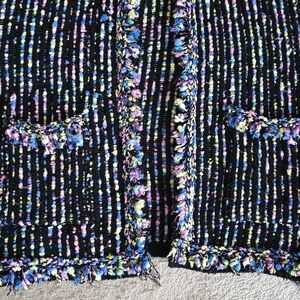 Open front cardigan, patch front pockets, fringe trim, multicolor tweed pattern. In very good used condition