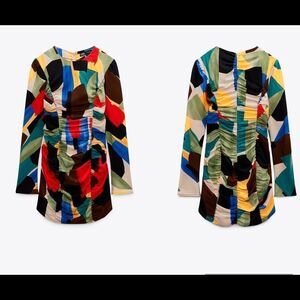 ZARA multicoloured printed dress with draping long sleeve ruched Sz S NWT