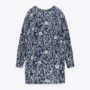 Zara navy blue and white floral jacquard long sleeve mini dress NWT