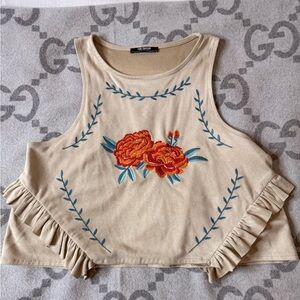 "Indulge in the bohemian charm of our Zara orange floral crop top.