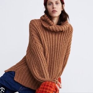 440187981 Zara oversized chunky knit wool blend sweater turtleneck brown medium
