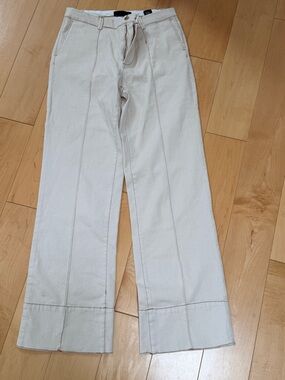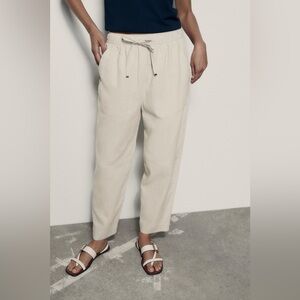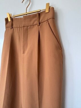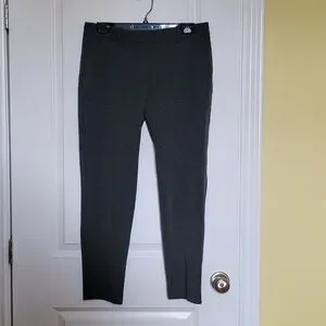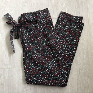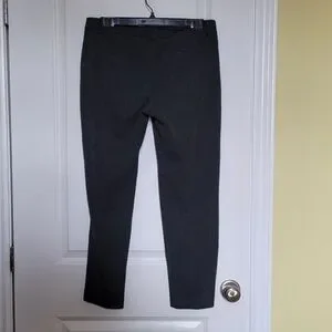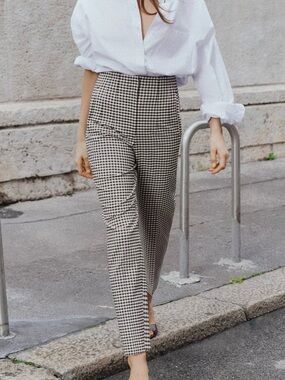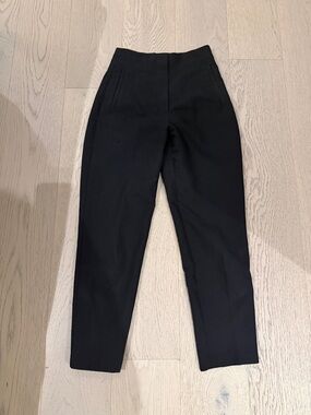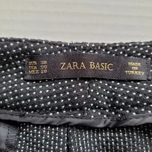 Zara Basic pants. Black with white mini polka dots. You can feel the texture of the dots. Mid rise. Belt loops. Hook and eye, button, and zipper. Straight leg. Waist and right back pockets. They are marked a size 6, but would be loose fitting. The materials tag is missing. There are not any stains, tears, or holes. Very good, gently used condition.