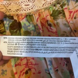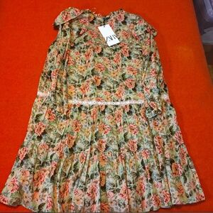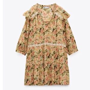 Zara peasant warm colours floral ruffles and lace low wasted short dress new with tags. Super lightweight and cooling weave made of 55% viscose and 45%cotton, V neckline, below the elbow sleeves, crochet lace insert and ruffles details all over. Strong boho cottagecore vibe, oversized loose fit. Marked size US M but it will fit a size L very well too. All measurements are approximate and taken with the garment laying flat: Armpit to armpit 22" Total length 31". This item comes from a smoke free, pets friendly home. Recycled bags/box used when possible. Please, let me know if you'd like any additional info. Thanks for watching!