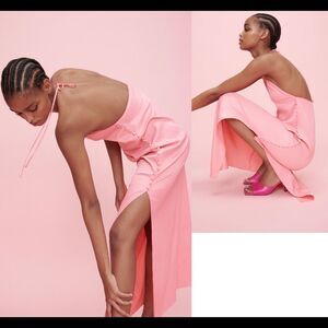 Long satin effect dress with halter neck and adjustable ties at collar. Self lined buttons at side. Slit at hem.