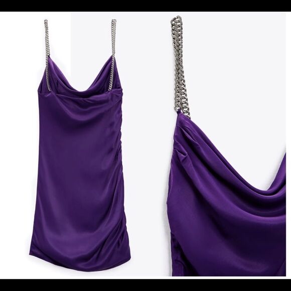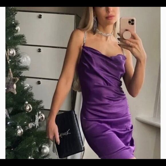 Zara purple draped ruched satin effect rhinestone bloggers fave dress Sz L NWT