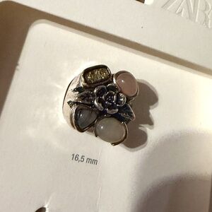 Zara silver textured metal ring with inset colored resin stones new in the original packaging (that I opened to take out the golden ring). This gorgeous unique ring comes from a two-pack rings that are from the current collection and already sold out. I’m selling the silver ring because it’s too small for me. It’s marked size S Small = 0.65 inches (16.5 mm). This item comes from a smoke free, pets friendly home. Recycled bags/box used when possible. Please, let me know if you'd like any additional pictures and/or measurements or other info. Thanks for watching!