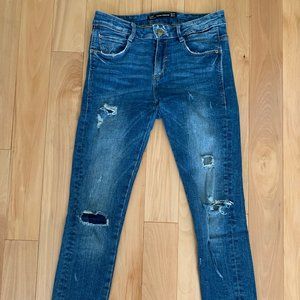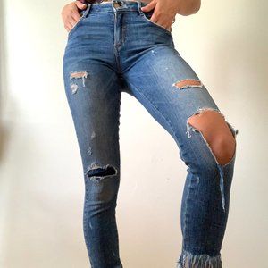 mid-rise skinny blue jeans with distressed look. Rip in the buttock area is part of the design.