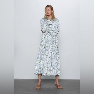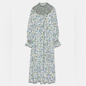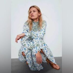Zara smocked embroidered Floral Blue and White Maxi Dress