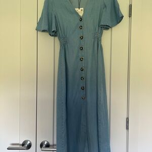 Flowy v-neck dress with short sleeves. Elastic waistband. Front button closure. TENCEL™ 100% lyocell