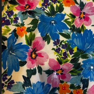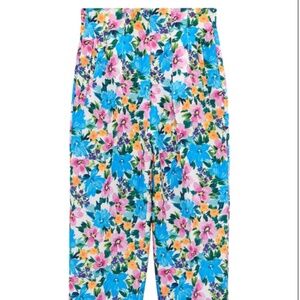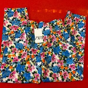 Zara vibrant flowers high waist pants new with tags. Turquoise, pink and yellow vibrant colored flowers on a white background, super stretchy weave made of 88% poly and 12% elastane, side pockets, tapered leg, relaxed hip and thigh, high waist. Marked size L. All measurements are approximate and taken with the garment laying flat: Waist 15" Front rise 12" Inseam 26" This item comes from a smoke free, pets friendly home. Recycled bags/box used when possible. Please, let me know if you'd like any additional info. Thanks for watching!